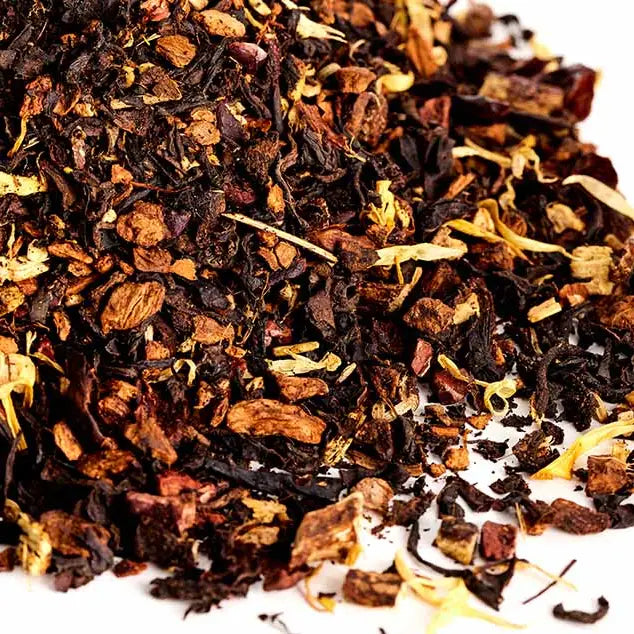 • Ingredients: organic black tea leaf, organic pu’erh tea leaf, organic roasted chicory root, organic cinnamon root, organic ginger root, organic licorice root, organic roasted dandelion root, organic cacao nibs, organic cascara shells, natural tamarind flavoring, organic calendula petals, organic reishi mushroom powder
