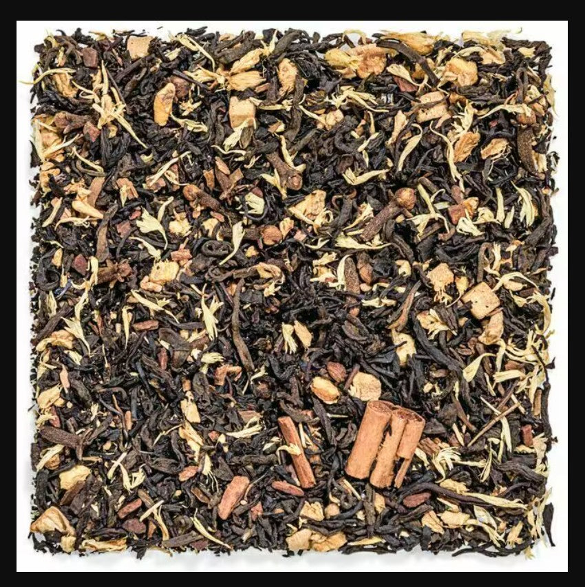 Ingredients: Pu'erh tea, ginger, cloves, cream caramel, cinnamon, cinnamon rods, dehydrated maple syrup, natural flavor, cinnamon, cornflower.