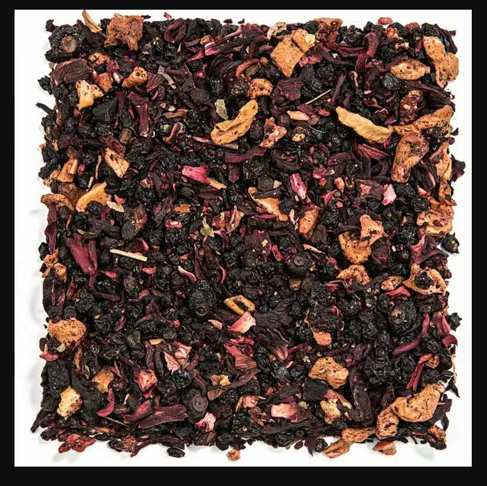 Ingredients: Elderberries, hibiscus blossoms, apple pieces, black currant, flavoring, freeze-dried blackberries, freeze-dried strawberry and raspberry pieces, wild strawberry leaves.