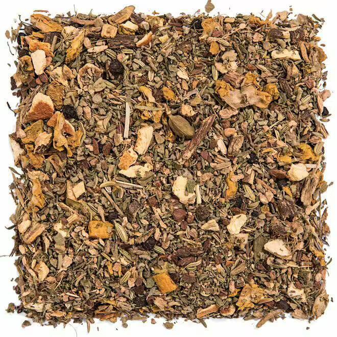 Ingredients: Ginger, cinnamon, licorice, fennel, orange, thyme, marshmallow root, turmeric, cardamom, black peppercorn, mullein flowers and natural flavor