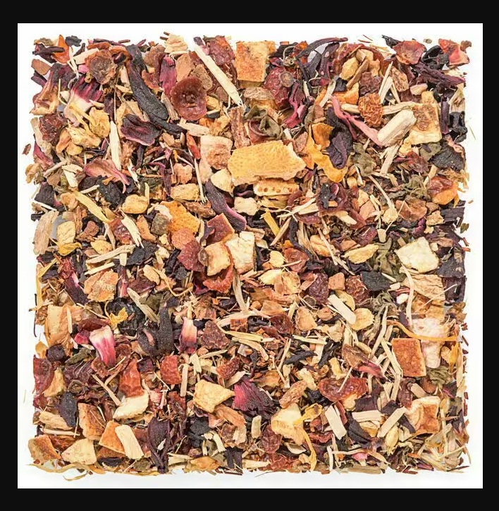 Ingredients: Rooibos, ginseng, tulsi, lemon, orange, hibiscus, ginger root, rosehips, cinnamon, rose petals, marigold flowers, vanilla flavor